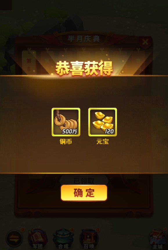 累積充值達到498元:5星武將箱*20,5星裝備箱*20,銅幣*2000萬