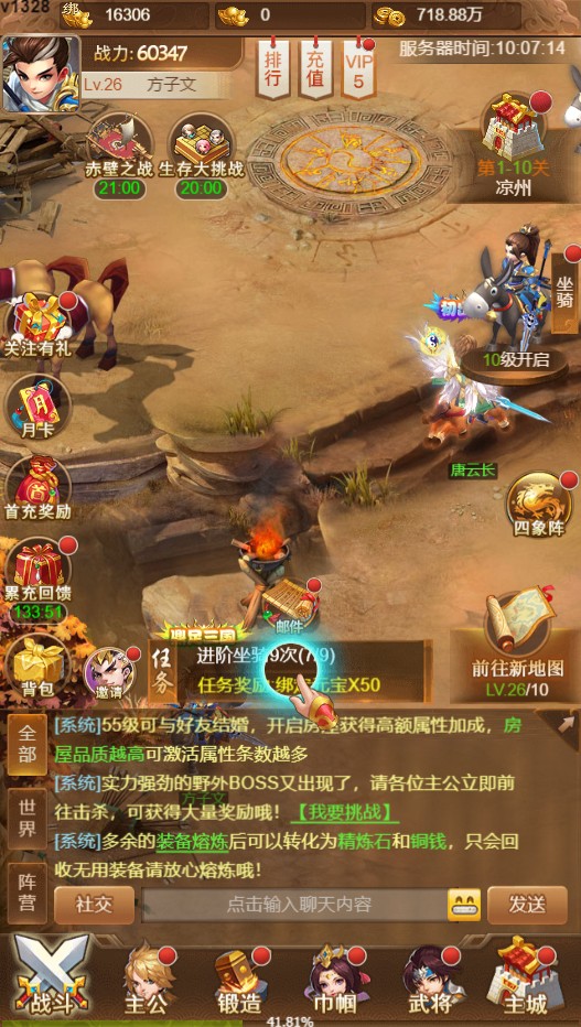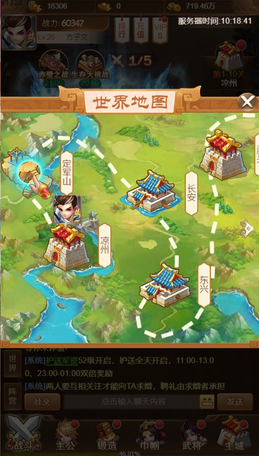 游戲的主線地圖非常豐富,玩家需要從涼州出發,再到定軍山,長安,東興等戰場pk,通過完成挑戰任務來獲取相應的裝備資源。