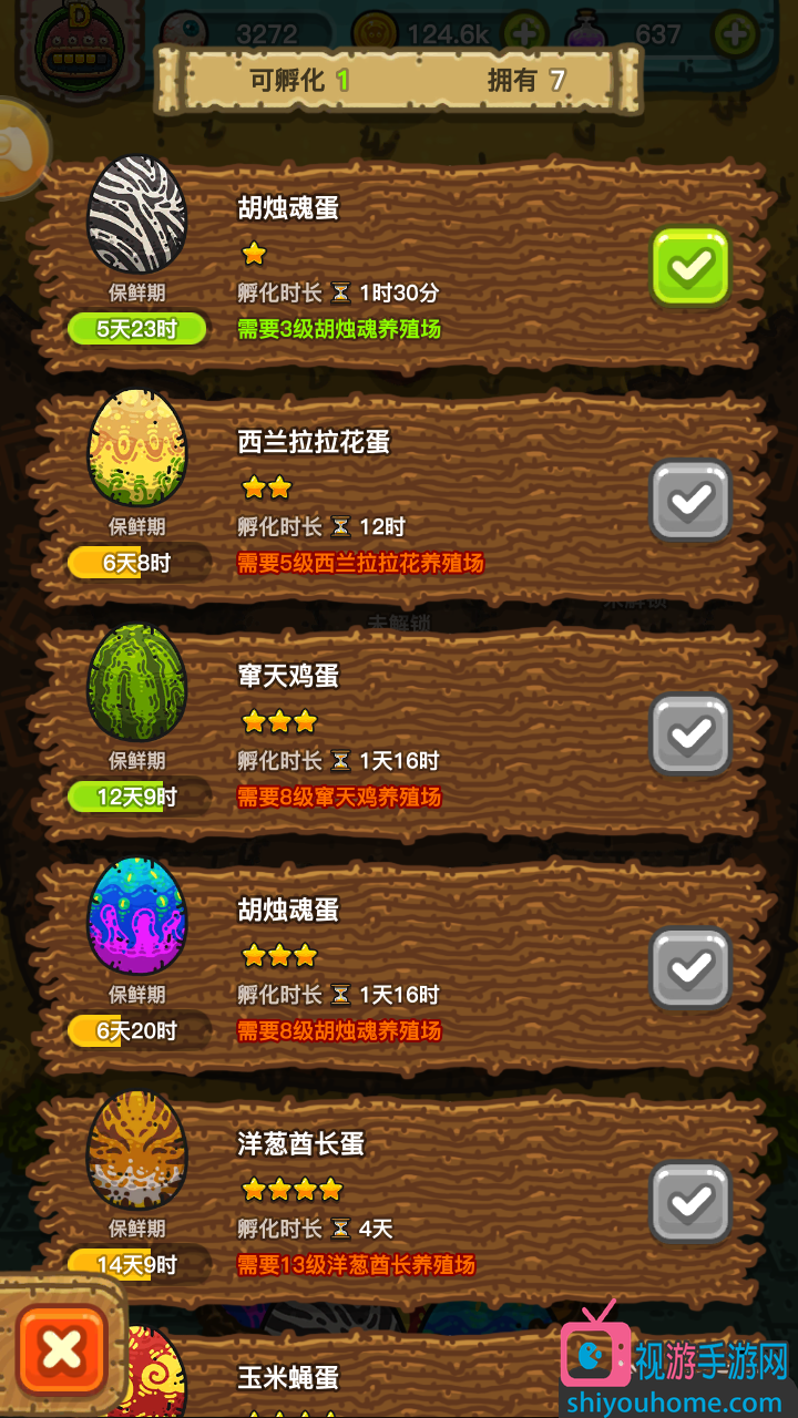 5、這個時候我們就能看到我們所擁有的怪物蛋,而只有顯示綠色“打勾”按鈕的蛋才可以孵化。