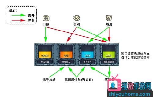 滿意度趨勢是所做的料理總的值。做的料理滿意度加的多,那趨勢就是正數(shù)。但是賣減滿意度的料理時滿意度會降,相反賣出加滿意度的料理時滿意值會漲。