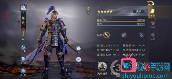 樂進在游戲中的武將定位為“武”、“迅”,所以比較適合組建成連擊隊。從滿級后的各項屬性來看,223.1的武力夠得上武將中的一流水準,239.4的攻速附帶2.58的成長,在整個游戲中都鮮有對手。因此可以看出,樂進的輸出實力非常可觀,加上其余各項屬性都沒有明顯的短板,所以非常適合作為隊伍的主力輸出武將出場。