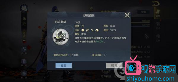 樂進的武將專屬技能為“風聲鶴唳”,效果為釋放連擊技能或主動技能時,對處于沉默狀態的敵人傷害提高最多70%。因此,這個技能可以配合其他武將攻擊的沉默效果使用,大幅提升樂進的輸出能力。