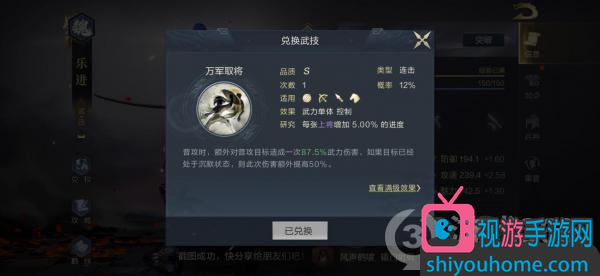 分解樂進后的兌換武技為“萬軍取將”,同樣非常適合搭配沉默效果使用,進而對敵方造成更加強力的武力傷害。