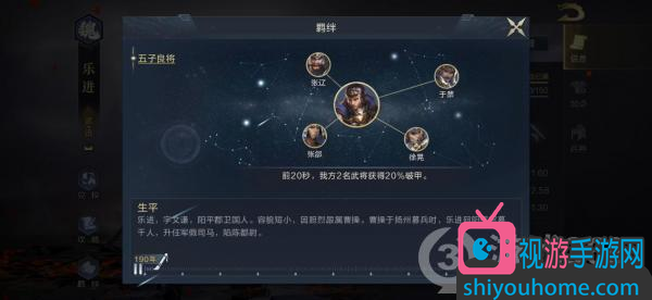 羈絆方面,樂進唯一的羈絆就是和張遼、徐晃、張郃、于禁組成的“五子良將”,效果為,在戰斗前20秒,為我方兩名武將提供20%的破甲。因此在武將陣容搭配時,因重點考慮從“五子良將”的羈絆中尋找武將,配合技能的沉默效果,打出高額爆發傷害。
