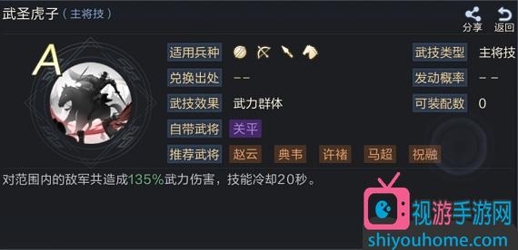 主將技:【武圣虎子】對范圍內(nèi)的敵軍共造成135%武力傷害,技能冷卻20秒;