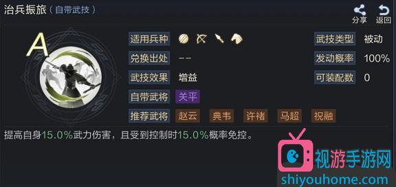 自帶技能(滿級效果):【治兵振旅】提高自身30%武力傷害,且受到控制時30%概率免控;