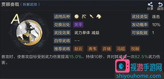 拆解技能(滿級效果):【貫頤奮戟】普攻時,使普攻目標受到武力傷害提高30%,持續(xù)10秒,并對其造成一次165%武力傷害