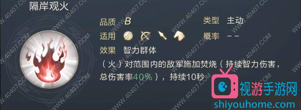 (火)對范圍內的敵軍施加焚燒(持續智力傷害,總傷害率40%),持續10秒。這是智力群體傷害,雖然不錯,但是還是不夠資格上陣的,很容易被碾壓。