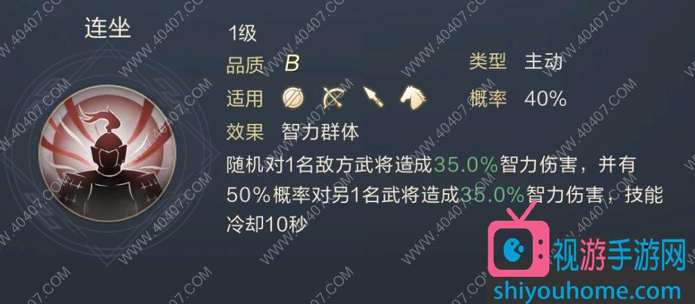 隨機對1名敵方武將造成35%智力傷害,并有50%概率對另1名武將造成35%智力傷害,技能冷卻10秒。