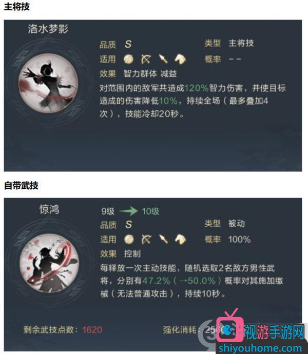 4.甄姬的特色技能,是S級被動技能“驚鴻”。作為一個被動技能,“驚鴻”的發(fā)動概率是100%。當甄姬每釋放一次主動技能,就可以隨機選取2名敵方男性武將,分別有25%概率對其施加繳械(無法普通攻擊),持續(xù)10秒。