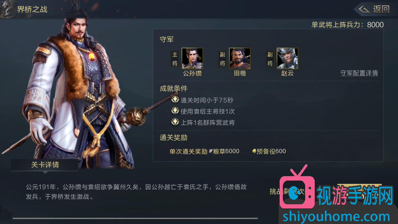 1.通關時間少于75秒;2.使用袁紹主將技1次 ;3. 上陣1名群陣營武將