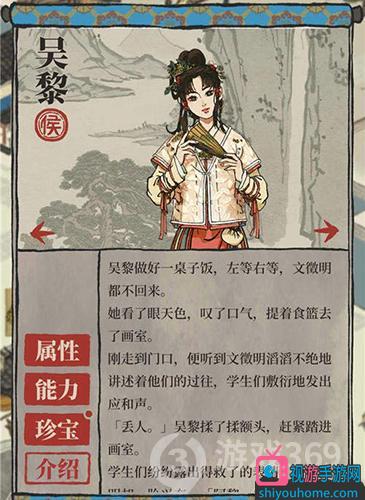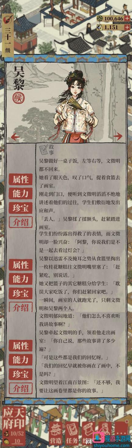 雖然在歷史上,文徵明的妻子確實是吳氏,但更多的信息卻并沒有被記載下來。不過在《江南百景圖》里最不缺的大概就是cp了,比如湯顯祖X麗娘,董其昌X董夫人,徐霞客X沈萬千、許宣X白素貞、嚴大人X阿琳(游戲設定,存在虛構,看看就行,不必當真),吳黎的人設背景應該是借鑒了歷史上吳氏的原型,畢竟文徵明和吳氏在婚后確實感情和睦,琴瑟和鳴,還是蠻幸福的。而在游戲設定里,文徵明也是一個時常和學生秀恩愛的老師角色,在上課時間總是和學生講自己和吳黎小姐姐的幸福生活。
