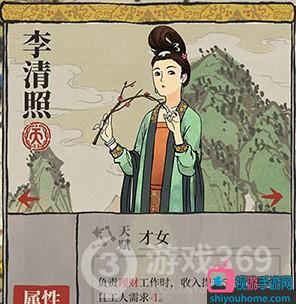 首先看下李清照的天賦,可以發現,她在負責理財工作的時候,可以將收入提升50%,然后還可以減少1個工人的需求。