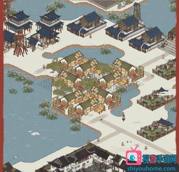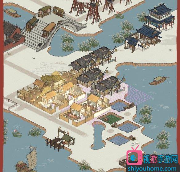這里從左到右發光的是3養蠶場2絲織坊2繡房,不發光的從上到下4餐館4菱角池。