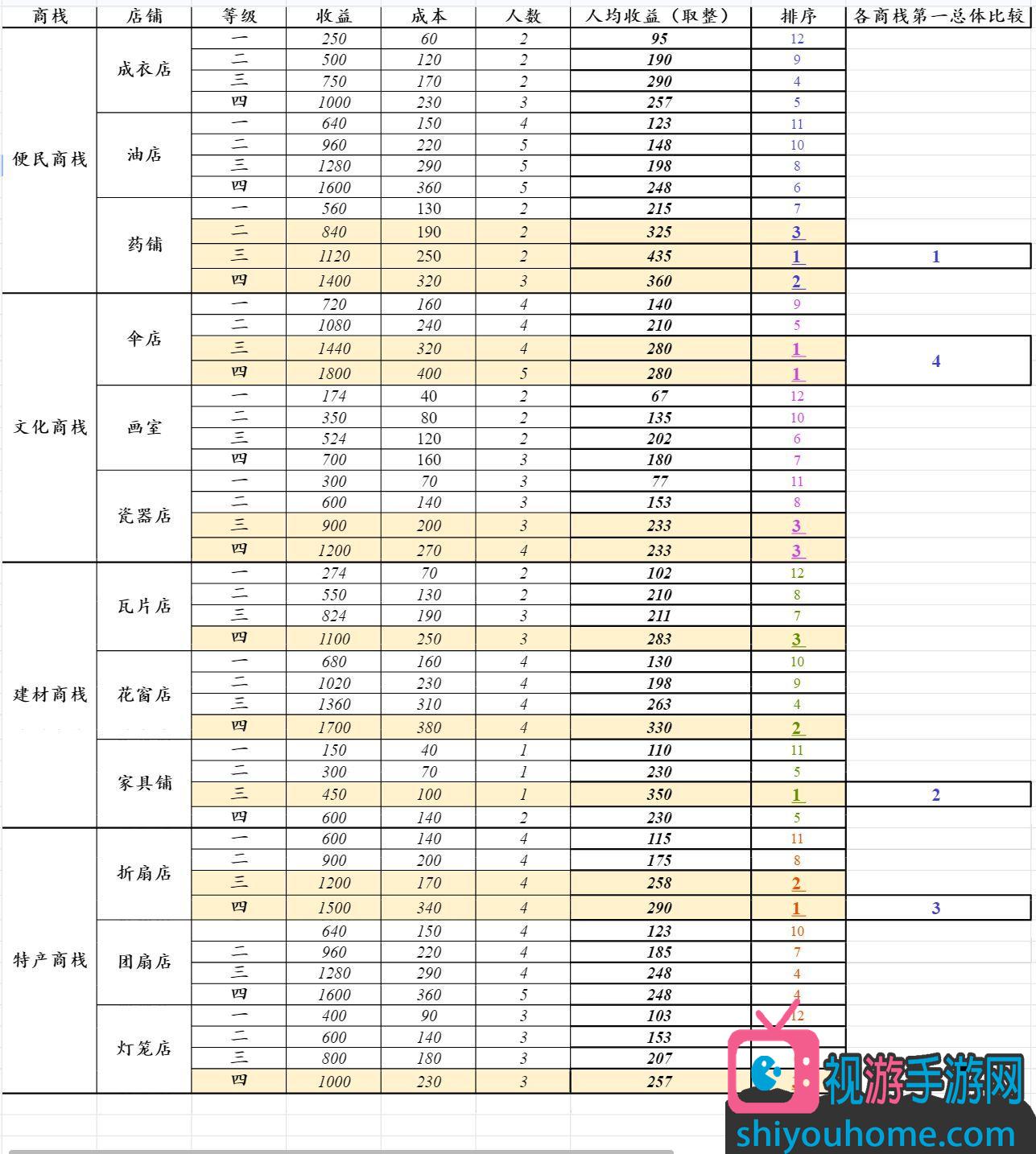 2.布局基礎(chǔ)是四個不同的商棧布局,五商棧是因為對總體布局有所影響,而且也不一定會有更高的收益,所以摒棄掉了。不選相同商棧原因很簡單,沒有必要為了刷錢而刷錢,既然銅幣有上限,就選擇個人最偏好的方式來賺錢即可,后期也不用拆掉了再建別的商棧。
