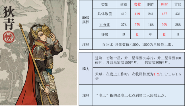 狄青,設(shè)定是農(nóng)牧,但屬性即使*1.2,也很垃圾。勉強(qiáng)推薦農(nóng)牧和理財(cái)。