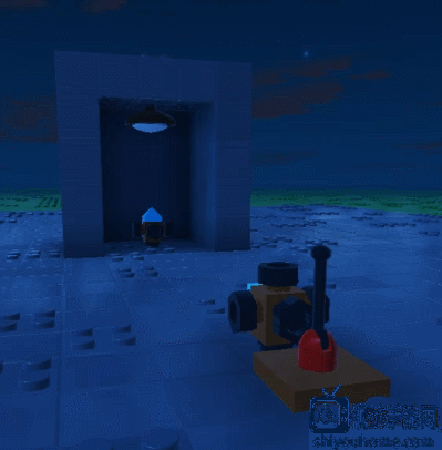 接著隔開一段距離,在正對著第一個信號中繼器的地方放置一個拉桿。之后,再放置一個信號中繼器在拉桿的前方,注意黑色部分面對拉桿,藍色部分面對第一個信號中繼器。這樣,我們就做好了一個自動開關燈系統,讓我們快點試試看吧(為了方便看出效果,這里在黑夜里測試)!