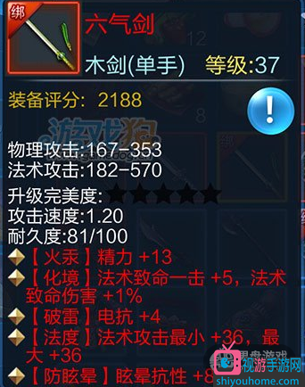 解析:一件紅色的裝備最少有4條固定特效,這件37級(jí)的六氣劍多爆出了一條屬性,我們來解析一下這把六氣劍,37級(jí)擁有最高法術(shù)攻擊570+特效法術(shù)攻擊36一共606法術(shù)攻擊,37級(jí)的裝備沒有升級(jí)的情況下達(dá)到606法術(shù)攻擊,刷副本,做師門無壓力啊,裝備特效火汞,精力+13,13精力這屬性加成相當(dāng)可觀,防眩暈這一屬性在刷副本或于玩家pk時(shí)提高了自身角色的生存率。總結(jié):一件裝備的好與壞,并不能直觀的從面板上判定,還要從特效是否符合自身角色的技能上綜合評(píng)價(jià)。