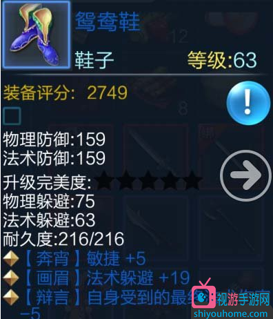 鴛鴦鞋特效:奔霄,敏捷+5。畫眉,法術躲避+19。辯言,自身受到的最終法術傷害-5。昭鑒,幻抗+4。抵御,物理防御+109。