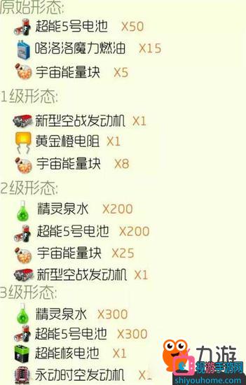 3級形態:精靈泉水*300+超能5號電池*300+宇超能核電池*1+永動時空發動機*1