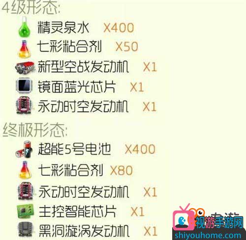 4級形態:精靈泉水*400+七彩粘合劑*50+新型空戰發動機*1+鏡面藍光芯片+永動時空發動機*1