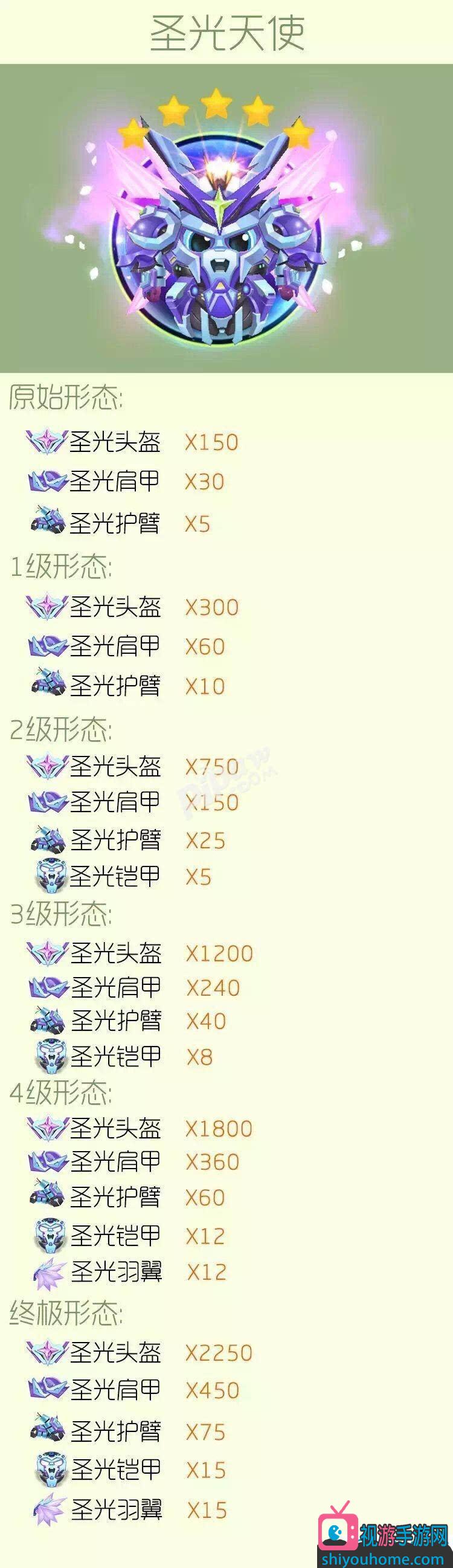 終級形態:圣光頭盔*2250+圣光肩甲*150+圣光護臂*75+圣光鎧甲*15+圣光羽翼*15