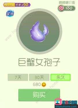 巨蟹女孢子是巨蟹座專屬皮膚,還有另外一款巨蟹男,它們是一對的,還可以獲得90點Show經驗哦!