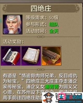 四絕莊副本參加等級是50級,需要小伙伴們組隊參加,副本獎勵為手工裝備的打造符,英雄譜禮物和珍貴的跑環道具焦尾琴。這個副本的難度較高,所以小伙伴們參加的時候一定要組滿五個人。