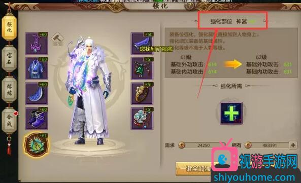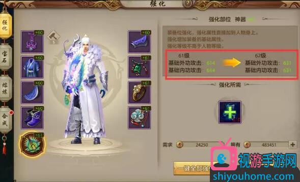 強化位簡介:游戲中最開始可以強化的裝備位置有八個,隨著玩家等級的提高,在獲得神器和暗器系統(tǒng)之后,還會增加兩個。每個裝備位置每成功強化一次,都會增加裝備的基礎(chǔ)屬性。可強化裝備和屬性如下。