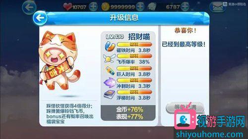 伯爵的沖刺技能在獎勵關外釋放,不僅能充分發揮綠巨熊沖刺破壞障礙物加分的技能,還可以完整地吃到若干組金幣,招財喵更是能召喚出高分福袋寶寶。這個搭配十分適合喜歡跑距離的大家哦。