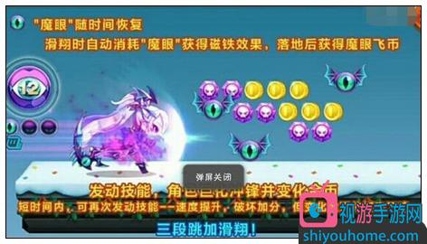 3、“魔眼”隨時間恢復,滑翔時自動消耗“魔眼”獲得磁鐵效果,落地后獲得魔眼飛幣,三段跳后滑翔