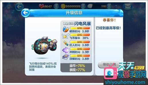 主要看一下技能。乍一看只有多人戰的技能,單人模式也是有的,飛行得分加成140%,吃到燃料道具表現分提高。多人對戰中吃到閃電能量一定時間內敵方道具攻擊減弱同時增強能量值。